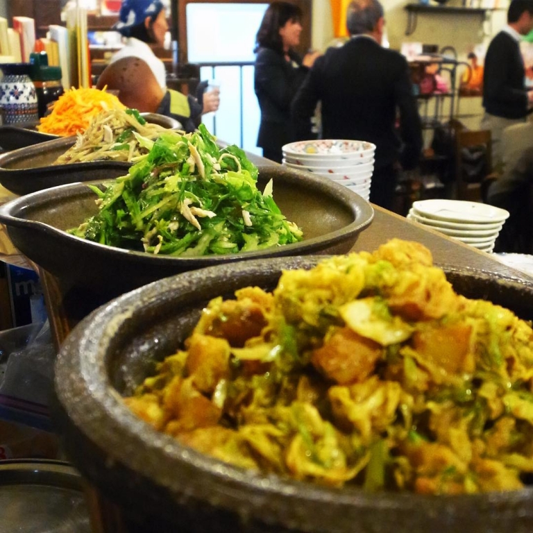 single いつものお惣菜も45名のご宴会用!大きな鉢は手前から「新じゃがとキャベツのサブジ」「セロリと蒸し鶏のレモンマリネ」「ごぼうとピーマン、蒸し鶏のわさびあえ」そして「にんじんのスパイスサラダ」!さあ、わんさとたべてくださいな!(笑)(お)