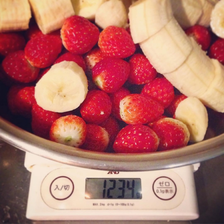 single 今日から3月、春ですよ〜♪ 春と言えばいちごの季節〜♪ ミックスフルーツ酢のドリンクも、いちご初仕込みです。計りの数字に注目(笑)(ぬ)