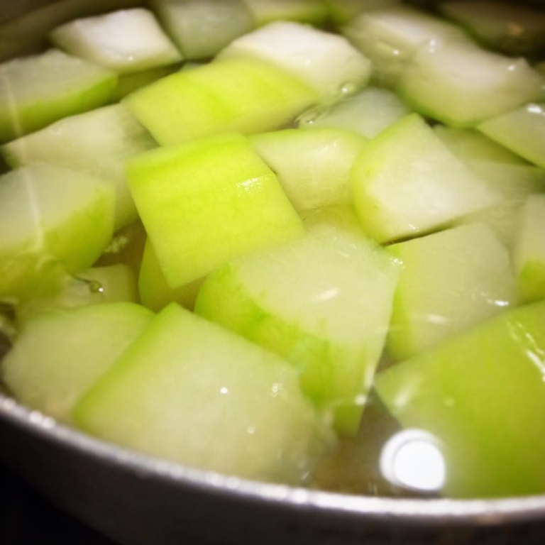 single さてと今季初登場の冬瓜をさっくり下茹でして翡翠色、今夜はあっさりやさしいそぼろ煮でお目見えですよ!ほっとする味、夏ですなー(お)